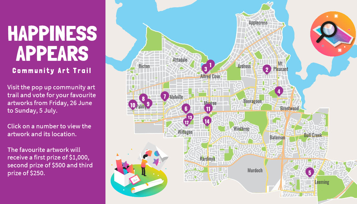 Voting is open from 8.00 am on Friday, 26 June to 5.00 pm on Sunday 5 July 2020.Find your favourite artwork and share it on Instagram #creativemelville #happinessappearsmelville The winning artists will receive a first prize of $1,000, second prize of $500 and third prize of $250. Winners announced Tuesday, 7 July 2020.For more information visit:https://www.melvillecity.com.au/our-city/connect-with-us/melville-talks/engagements/happiness-appears