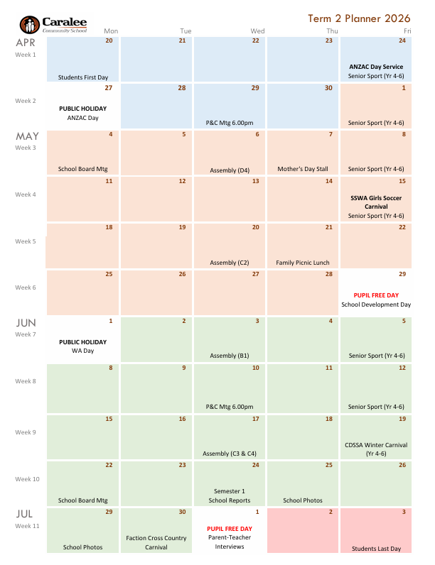 WA Govt regulations and advice may impact on term planning. Please ensure term planners are read in conjuction with messages via CONNECT.